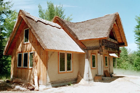 The Workshop's timber frame was designed to provide the greatest amount of open space, with the least amount of timber and labor. To achieve this, king-post trusses, spanning 32 feet, were used. The rafters are 20 feet, but all of the remaining timbers are 16 feet and under. The frame was cut in the June 1995 workshop. The roof and walls are covered with compressed wheat straw panels with local pine covering the walls and steel roofing.